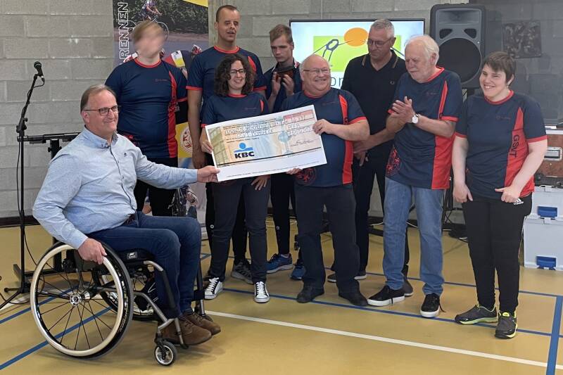 Yvo Beckers, kernverantwoordelijke van GSVT-paracycling, nam de cheque van 4.331 euro voor het G-wielrennen in ontvangst. Jan Niesen, die ten tijde van ‘De Warmste Tandemtocht’ kernverantwoordelijke was van onze sportkern, mocht vervolgens onze cheque van 4.331 euro in ontvangst nemen.
