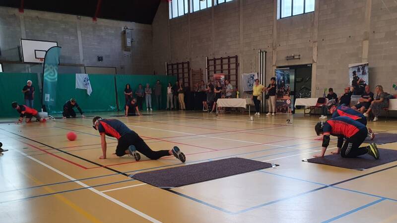 Om praktische redenen was het niet mogelijk om ook de doelen op te stellen, die normaal op elke korte zijde van het terrein horen te staan. Toch kregen de mensen een goed beeld van deze sport, dankzij de deskundige begeleidende uitleg van Johan Vanhoof van ViGe Mol. Lees hier meer over torbal.