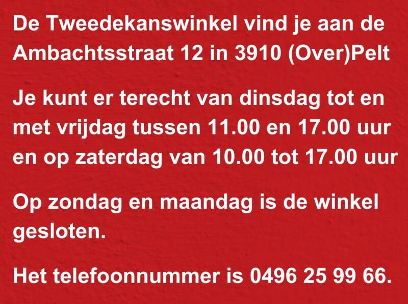 Er bestaan tegenwoordig meerdere winkels en winkelformules waar gebruikte spullen te koop worden aangeboden. Eén daarvan is de Tweedekanswinkel in Pelt. Na enkele keren te zijn verhuisd is de winkel nu ingericht in de vroegere houtafdeling van de oude vakschool TIO in Overpelt. De winkel zit vol met de meest interessante spulletjes. Het is een initiatief van Philo Van Herck die de winkel runt samen met een ploeg vrijwilligers. De tweedehandsspullen zijn er voor een prik te koop.
